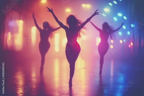 Fototapeta premium Dancers performing in a vibrant urban setting illuminated by colorful lights at night