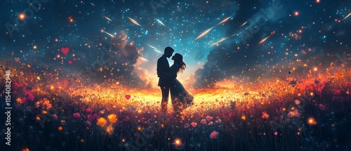 Naklejka premium Dancing Among Glowing Flowers Under a Sky of Shooting Stars, a Couple Creates...