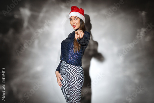 © Igor Link, Naklejka premium Dancing and contented christmas woman at the party in rexlexion light