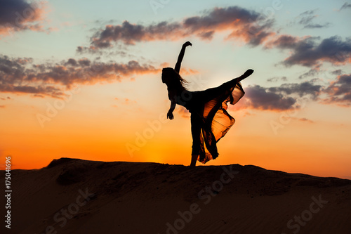 Naklejka premium Dancing at night in the sand against the backdrop of the setting sun, the silhouette of a dancer.