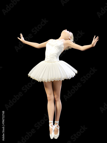 © vladnikon, Naklejka premium Dancing ballerina 3D. White ballet tutu. Blonde girl with blue eyes. Ballet dancer. Studio photography. High key. Conceptual fashion art. Render realistic illustration. Black background.
