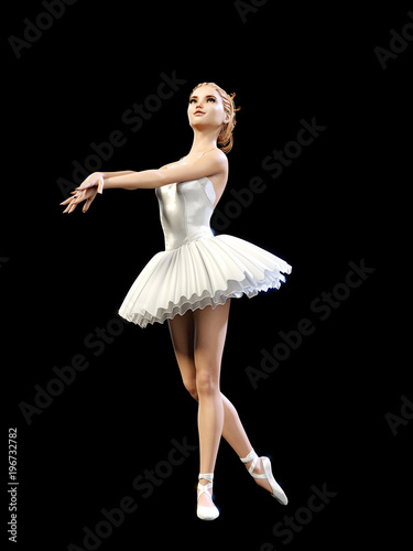© vladnikon, Naklejka premium Dancing ballerina 3D. White ballet tutu. Blonde girl with blue eyes. Ballet dancer. Studio photography. High key. Conceptual fashion art. Render realistic illustration. Black background.
