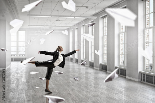 © Sergey Nivens, Fototapeta premium Dancing businesswoman in office . Mixed media