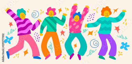 Fototapeta premium Dancing cheerful people men and women vector colorful illustration. Flat design. Doodle, holiday, fun, party.