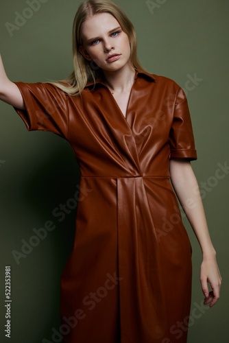 Fototapeta premium Dancing elegant pretty young blonde female in leather brown dress holding hands up looks aside posing isolated on over olive green studio wall background. Cool fashion offer for new collection banner