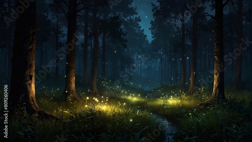 © Alula, Fototapeta premium Dancing fireflies in forest