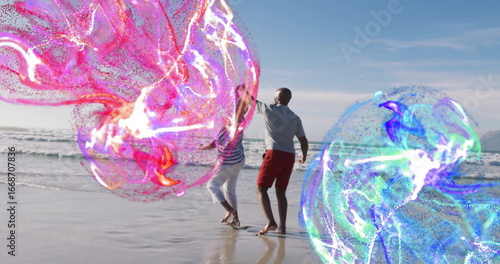 Fototapeta premium Dancing mature couple reaching toward swirling energy orbs at beach shore,...