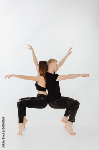 © oksana_bondar, Fototapeta premium Dancing Pose of Two Talented Young Dancer Couple. Caucasian Boy and Girl Wear Black Jeans Balance on Toe Isolated on White Background. Professional Male and Female Perfomer Touching Back Side View