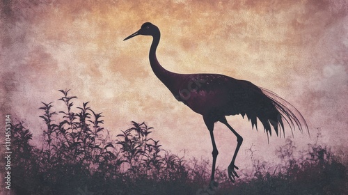 © Chaikit, Fototapeta premium Dancing sarus crane silhouetted against dusky purple horizon, elaborate courtship display with neck arched gracefully, intricate stippled texture throughout plumage, vintage lithograph style with