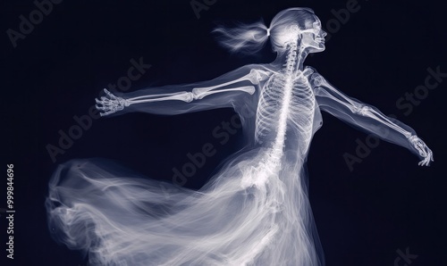 © Аrtranq, Naklejka premium Dancing Skeleton with Flowing Dress on Dark Background
