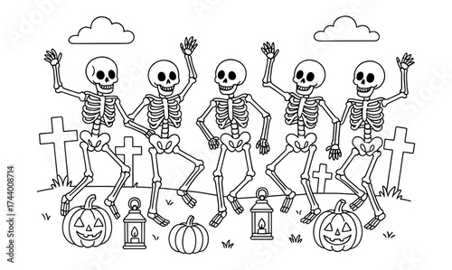 Obraz premium Dancing skeletons in a graveyard with pumpkins and lanterns in black and white