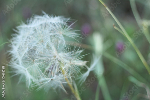 © Sever, Fototapeta premium Dandelion flower with seeds ball close up in horizontal view with space for text. Postcard image design.
