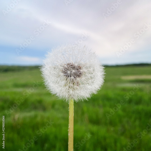 © andrbk, Naklejka premium Dandelion in a field. Green background colors of spring. Selective focus image.