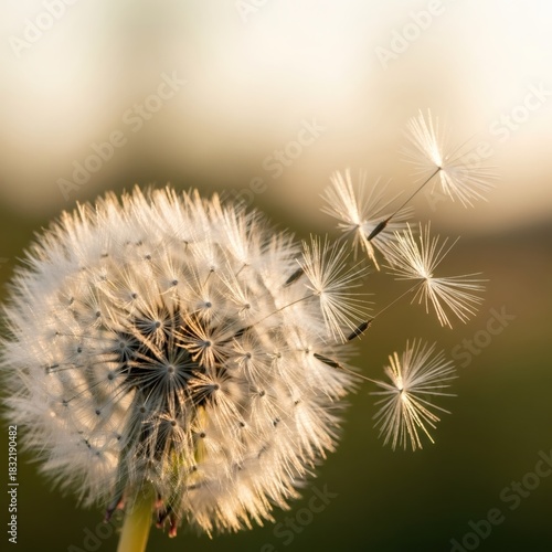 © Katsyarina, Fototapeta premium Dandelion seed dispersal in sunny field. Macro close-up of a dandelion releasing seeds. Nature and growth concept for spring.