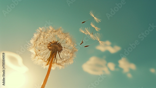 Obraz premium Dandelion Seed Drifting Freely in the Air Against a Clear Blue Sky