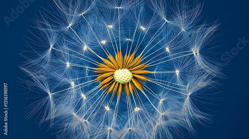 © Souta, Naklejka premium Dandelion Seed Head Close-Up: Digital Illustration on a Deep Blue Background AI Generated