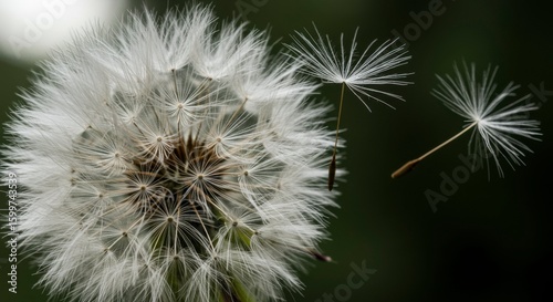 © Hox, Obraz premium Dandelion seed head with some seeds already airborne, against a blurred background