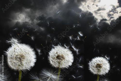 © andrewbretwallis, Obraz premium Dandelion seed heads blowing against summer storm clouds