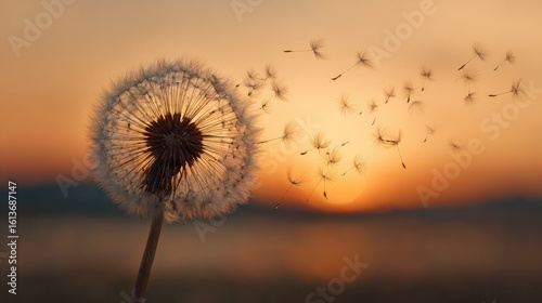 Naklejka premium Dandelion seedhead at sunset