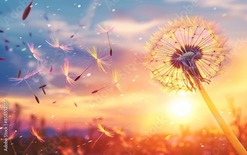 Obraz premium Dandelion seeds blowing in the wind at sunset, symbolizing freedom and hope...