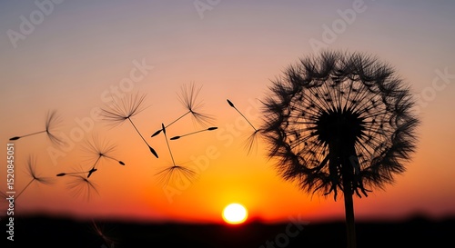 © zerostudio.id, Fototapeta premium Dandelion Seeds Flying Sunset