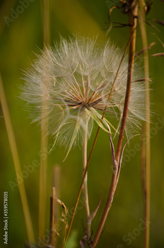 © Benjamin M. Weilert, Fototapeta premium Dandelion seeds on a green background.