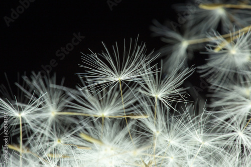 © donikz, Fototapeta premium Dandelion with macro seeds on a black background