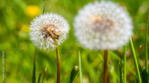 © alex, Fototapeta premium dandelions in the garden. the popular background and nature of the house. bright colors, good mood, summer time and sunny day
