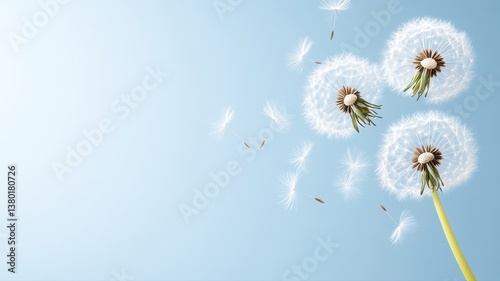 Obraz premium Dandelions releasing seeds against a clear blue sky, symbolizing growth and...