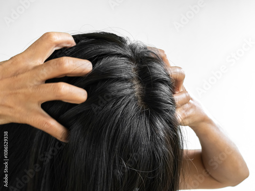 Obraz premium Dandruff Itchy scalp, woman chtatch hair messy she dirty, sensitive disease bacteria dander loss, concept for medicine hyginene champoo treatment skin for good health.