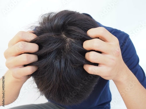 © Bungon, Fototapeta premium Dandruff or lice in his hair man and scratching her head for healthcare concept. closeup photo.