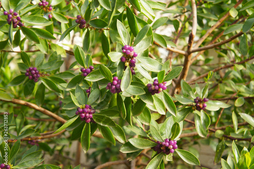 Obraz premium Daphne odora or winter daphne sweet amethyst shrub with purple berries
