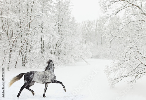 Obraz premium Dapple-grey arabian horse in motion on snow field