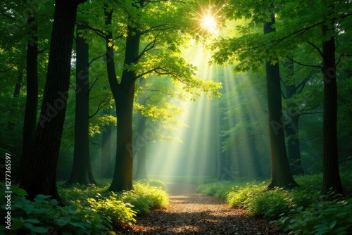 © Sathaporn Buarabut, Obraz premium dappled light filtering through forest canopy, shade, light, sunlight