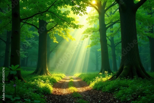 Obraz premium Dappled sunlight filtering through the forest canopy, forest, greenery