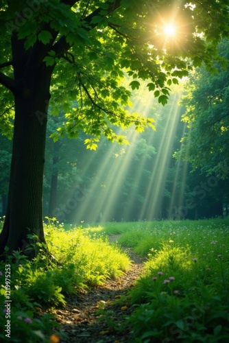 © anu, Obraz premium Dappled sunlight filters through a leafy canopy, shade, tranquility, sunlight