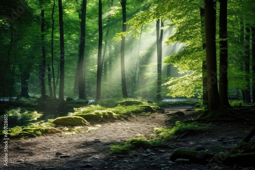 © Kanisorn, Obraz premium Dappled sunlight texture background, sun rays filtering through leaves, natural forest shadows backdrop, serene and enchanting.