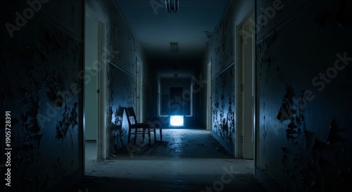 © Lena, Fototapeta premium Dark Abandoned Hallway with Chair and Mysterious Light Source
