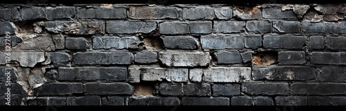 Fototapeta premium Dark, aged brick wall with crumbling sections and holes.