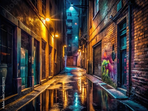 © kittipon, Fototapeta premium Dark Alley Night Scene - Low Light Photography of a Dangerous Urban Walkway