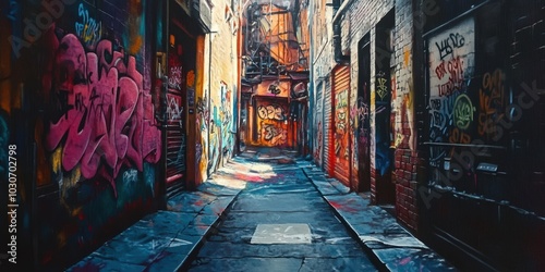 © Ali, Fototapeta premium Dark alley with graffiti and brick walls.