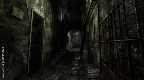 © almeera, Fototapeta premium Dark alleyway with barred passage, urban gloom, shadowed city
