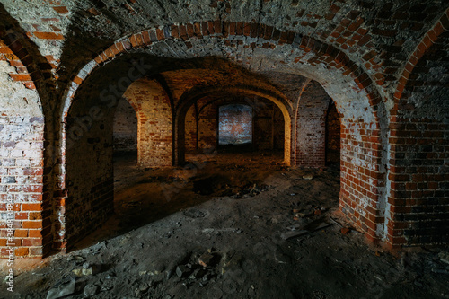 Fototapeta premium Dark and creepy vaulted red brick dungeon