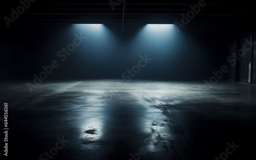 Fototapeta premium Dark and dark room wall with cement reflective floor, smoke and dim light