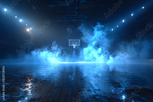 Naklejka premium dark and dramatic high school basketball court, basketball hoop, blue smoke, blue led lights