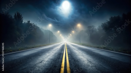 © Praphunsak, Fototapeta premium Dark and gloomy road at night with fog rolling in, fog, nighttime