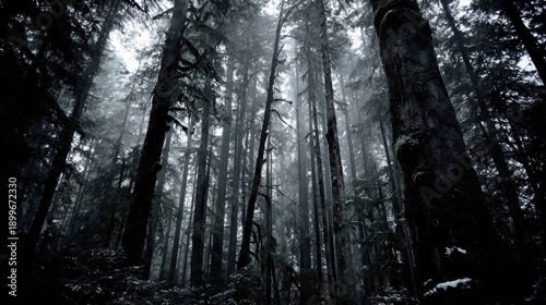 © Sagar, Fototapeta premium Dark and Misty Forest Scene with Tall Trees Reaching to the Sky in Monochrome