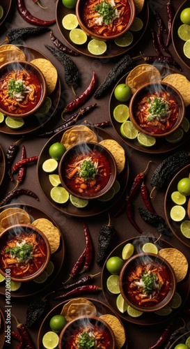 © virginiaf99, Fototapeta premium Dark and Moody Flat Lay Pattern of Authentic Mexican Pozole Soup
