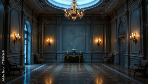 Obraz premium Dark and moody nighttime shot of an empty elegant room, bathed in soft...