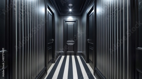 Obraz premium Dark and mysterious hotel hallway with black and white striped floor.